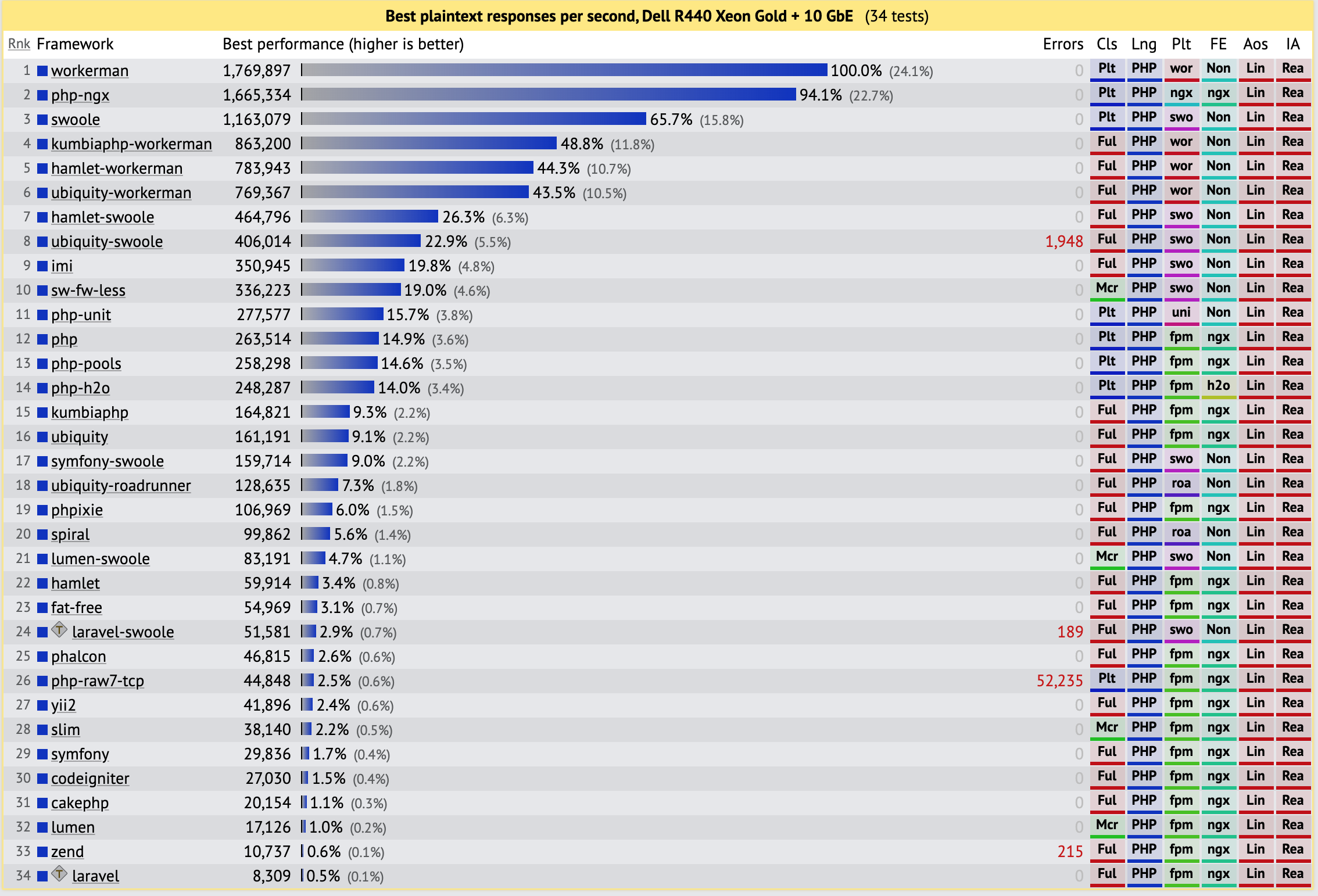 workerman php ফ্রেমওয়ার্কের বিভিন্ন সূচকে প্রথম স্থানে রয়েছে, পারফরম্যান্স ঐতিহ্যগত ফ্রেমওয়ার্কের তুলনায় প্রায় 10-200 গুণ বেশি।