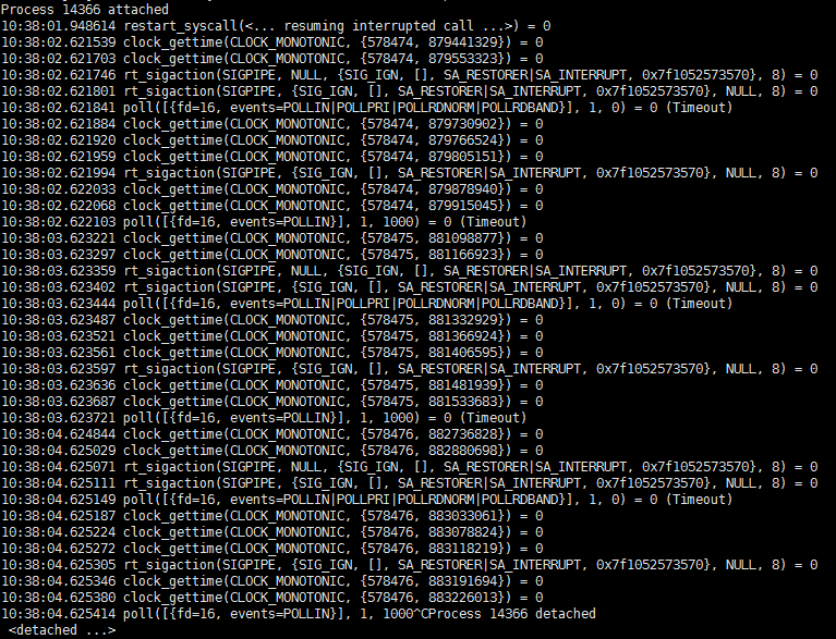 यह देखा जा सकता है कि प्रक्रिया निरंतर poll([{fd=16, events=.... सिस्टम कॉल में लूप कर रही है, यह fd के लिए 16 के डिस्क्रिप्टर के पढ़ने की घटना की प्रतीक्षा कर रही है, अर्थात्, यह इस डिस्क्रिप्टर से डेटा लौटने की प्रतीक्षा कर रही है।