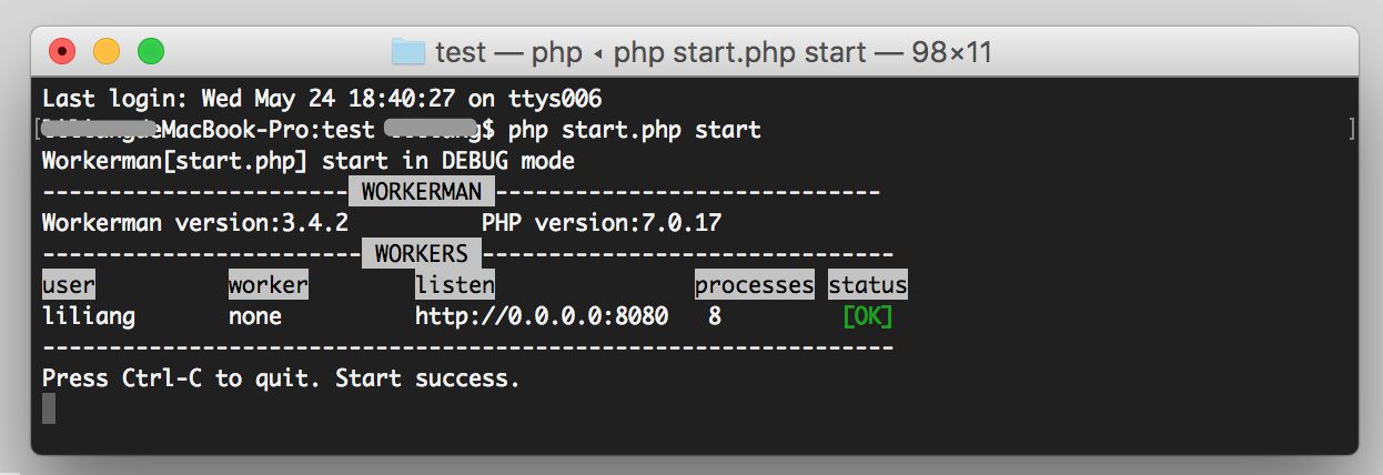 शुरुआत का तरीका apache के समान कमांड का उपयोग करके शुरू करना है (सामान्य वेब स्पेस में workerman का उपयोग नहीं किया जा सकता)। प्रारंभिक स्क्रीन नीचे जैसा होता है